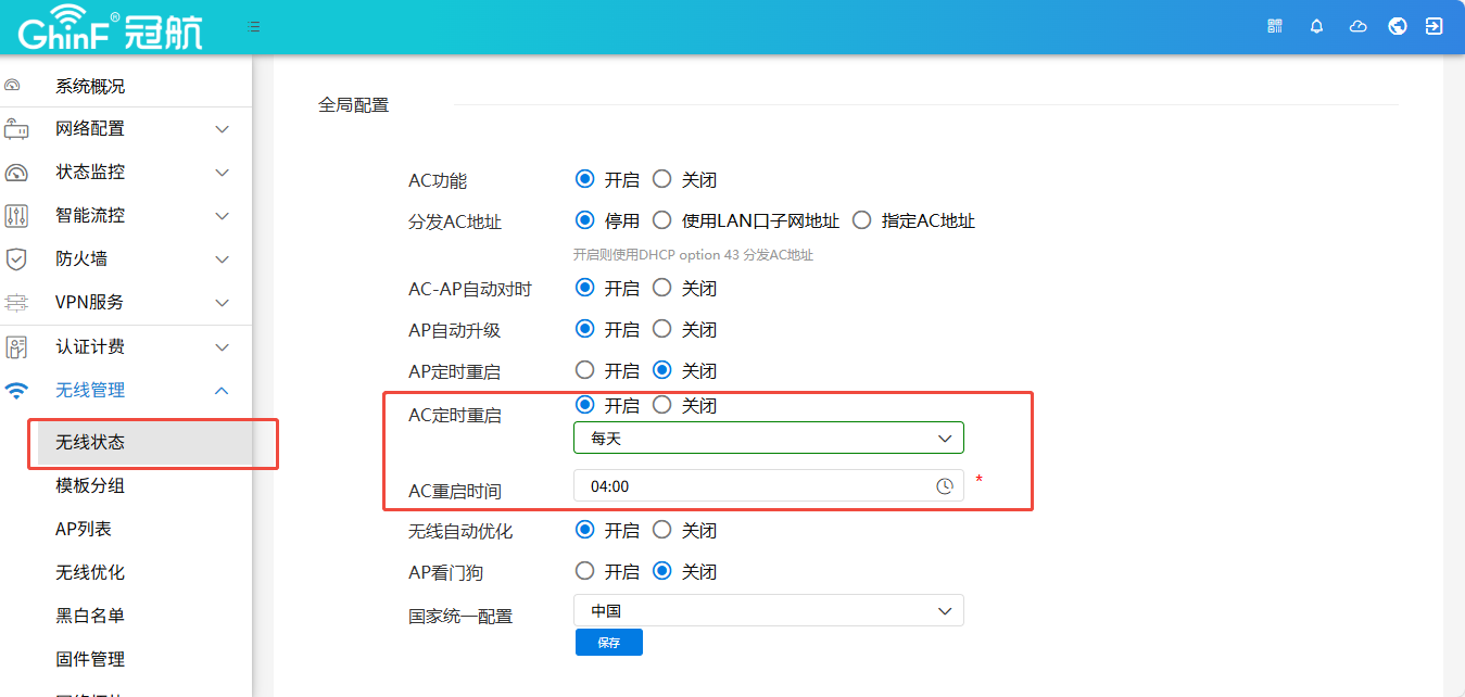 ### 1.新版本的网关,定时重启页面在:系统设置<---->系统维护<---->系统定时重启,如何设置重启时间和多长时间重启  ### 2.老版本网关的定时重页面在:无线管理 <-----> 无线状态 <---->AC定时重启