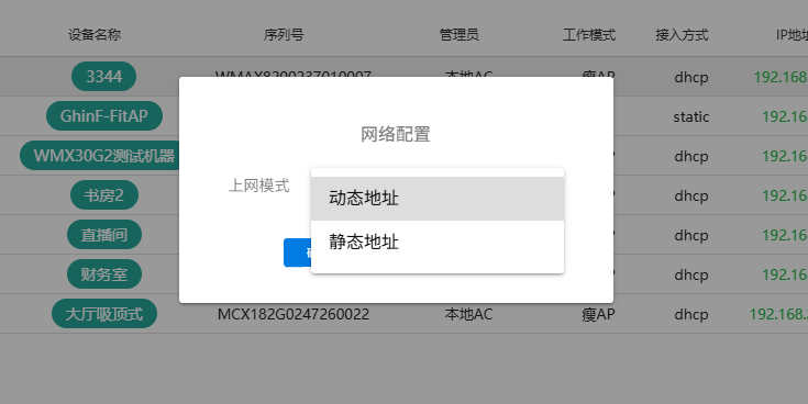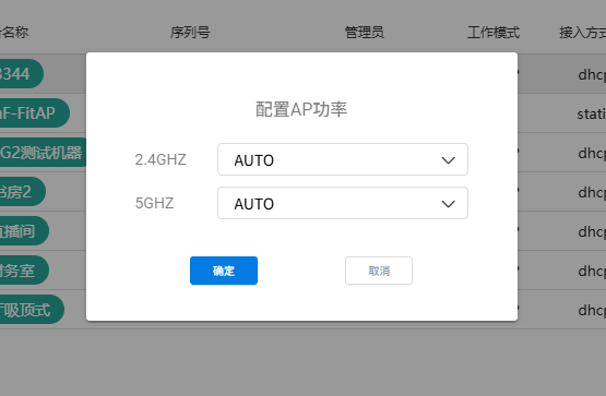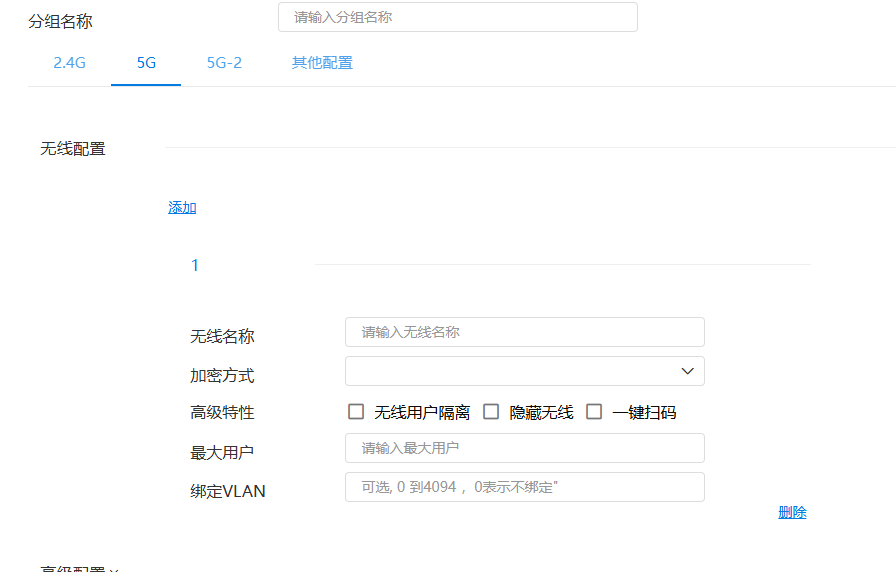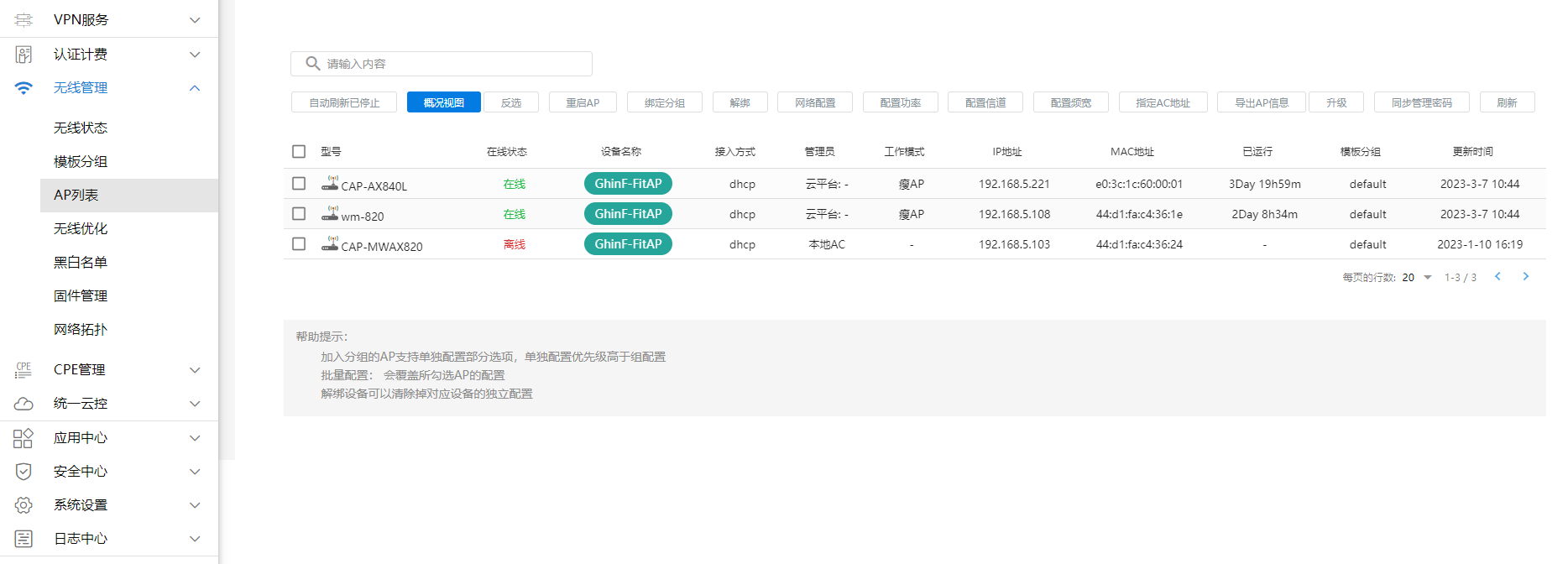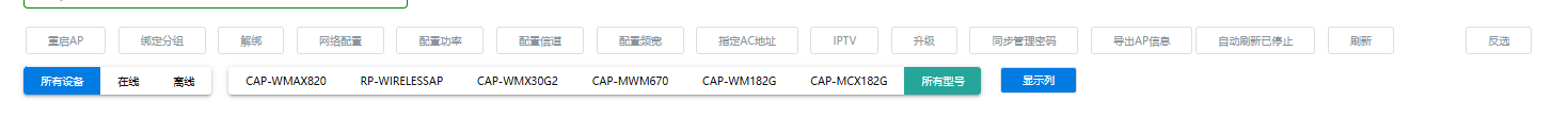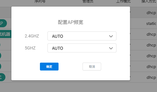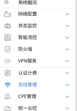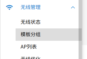 ## 第一步在网络配置中进入无线管理  ## 第二步进入无线管理中模板分组  ## 第三步选择添加  ## 第四步输入无线名称选择加密方式  ## 第五步AP列表 功能说明:AC控制,AP上线后可进行统一管理,统一修改配置  ## 第六步视图 概况视图:查看AP的基础信息 无线视图:查看连接人数,信道,功率,使用流量等 详细视图:查看AP的所有信息  ## 第七步绑定分组 选择AP后可以选择绑定到创建的模板分组中  ## 第八步网络配置 配置动态或者静态的IP地址  ## 第九步配置功率 配置2.4G和5.8G的无线信号发射功率  ## 第十步配置信道 配置2.4G和5.8G的信道  ## 第十一步配置频宽 配置2.4G和5.8G的信道带宽  ## 第十二步配置AC地址 配置AC控制器的地址  ## 第十三步同步管理密码 将AP的管理密码和AC同步
