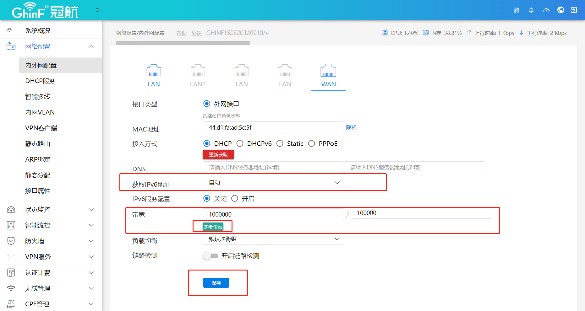 ## 开启网关ipv6 1.在浏览器输入网关管理地址(默认地址192.168.11.1),进入网关页面选择【网络配置】----【内外网配置】----【选择WAN口图标】  <p>2.在WAN口图标找到ipv6获取将其改成<span style="color:red;">自动获取 </span>,然后点击参考带宽选择实际带宽 进行保存