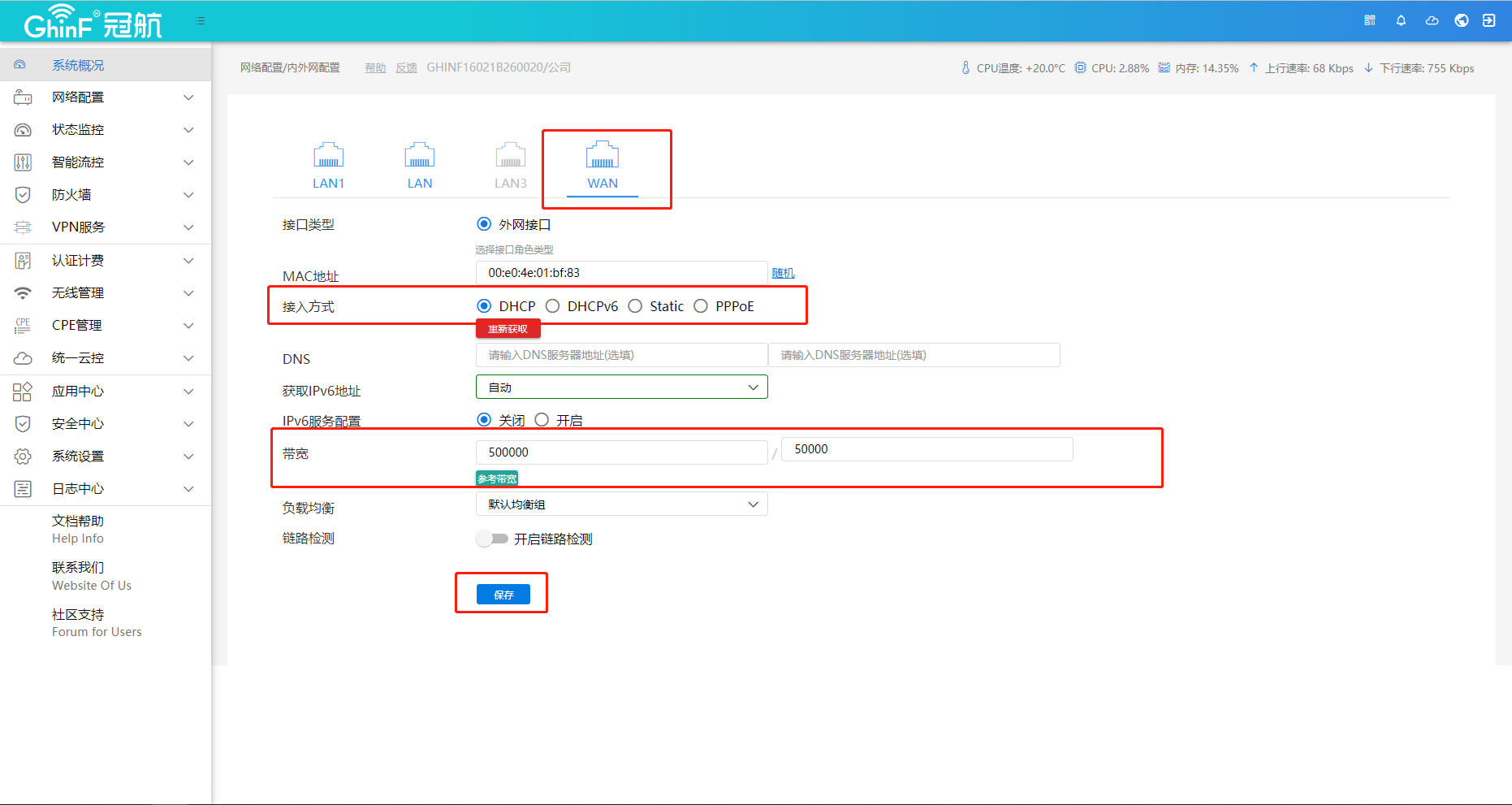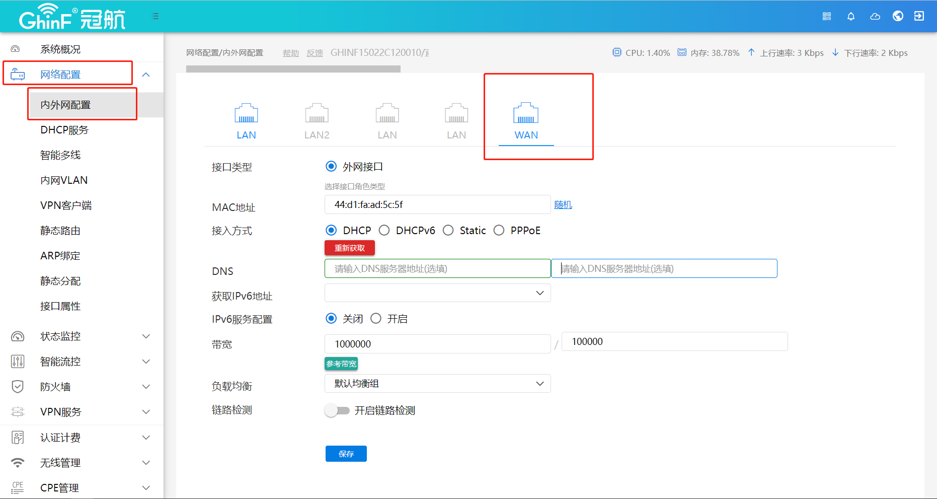 ### 网关设置 1.在浏览器输入网关管理地址(默认地址192.168.11.1),进入网关页面选择【网络配置】----【内外网配置】----【选择WAN口图标】  2.在WAN口找到接入方式,选择正确的接入方式 ,然后填写上实际带宽,lan口接内网设备 ><span style="color:red;">注:要保证设备正常上网