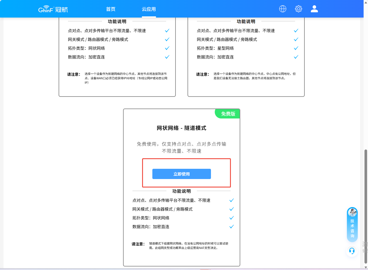 ## 云端组网 ### 1.点击上面的云应用,选择SD-LAN  ### 2.创建组网  ### 3.我的模式下面选择网状网络-隧道模式  ### 4.右下角填入项目名称后点下一步  ### 5.选择设备后点下一步  ### 6.保存